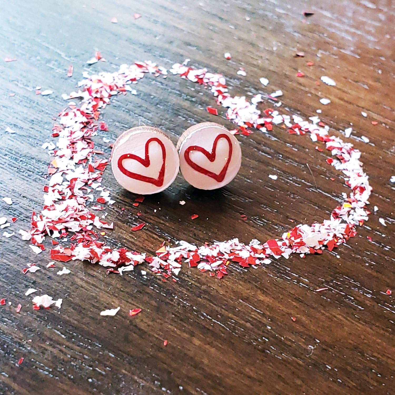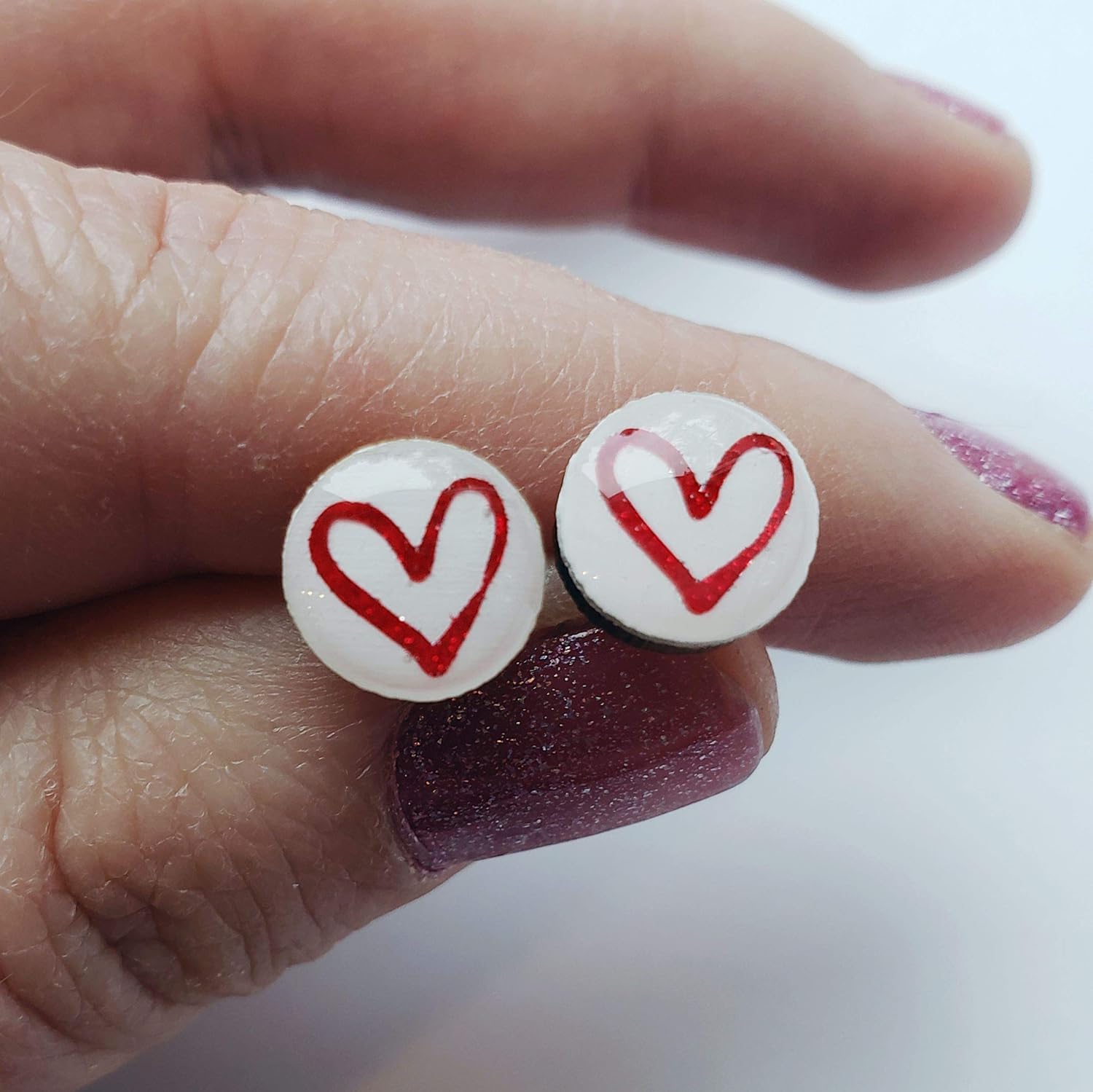 Hand Painted White With Bright Red Sparkle Heart Wood Stud Earrings 10mm Hypoallergenic Valentines Day Stud Earrings Mivital Ch